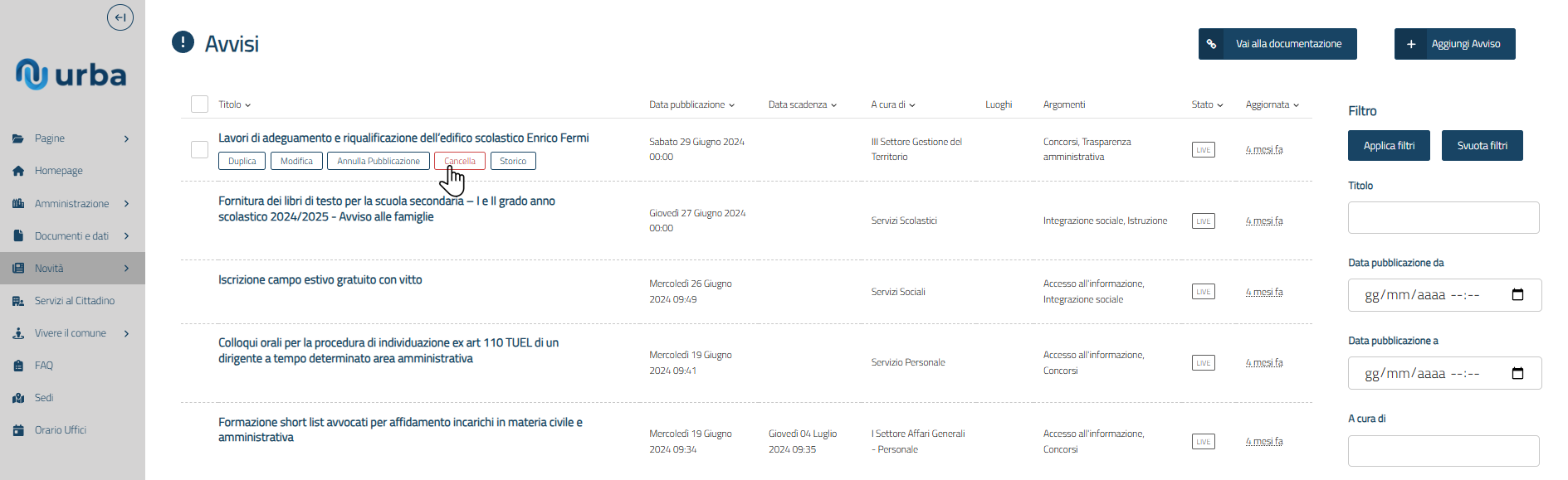 Per poter rimuovere una notizia, una volta effettuato l'accesso alla pagina Notizie, è necessario posizionarsi con il mouse in corrispondenza della notizia desiderata e selezionare il bottone Cancella: