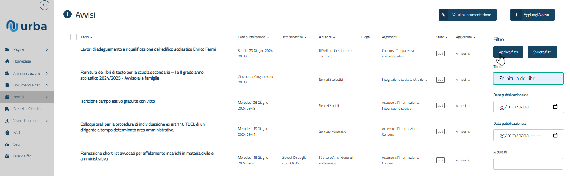 Nella pagina Avvisi è possibile filtrare i dati per Titolo, Data pubblicazione da, Data pubblicazione a e A cura di: