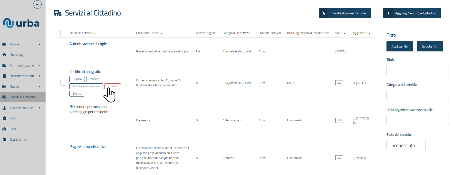 Per poter annullare la pubblicazione di un servizio, una volta effettuato l'accesso alla pagina Servizi al cittadino, è necessario selezionare il bottone Annulla pubblicazione in corrispondenza del servizio desiderato: