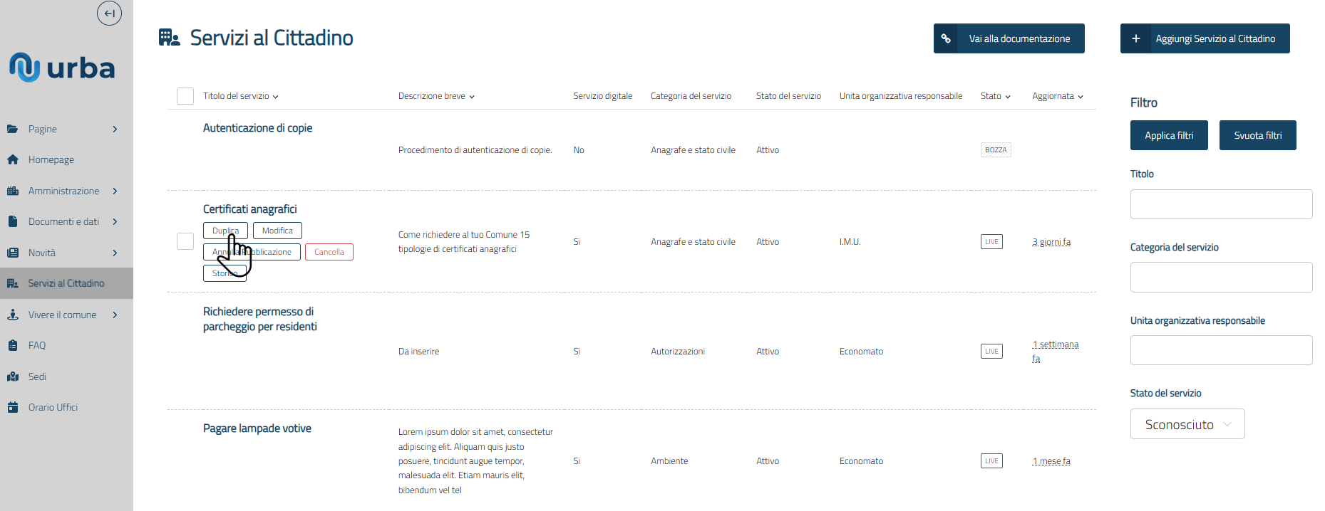 È possibile duplicare un servizio già presente. Per poter duplicare un servizio, una volta effettuato l'accesso alla pagina Servizi al cittadino, è necessario selezionare il bottone Duplica in corrispondenza del servizio desiderato;